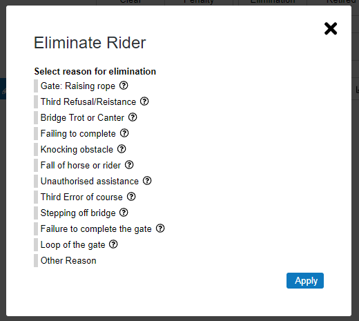 Touching the Elimination button will display a list of reasons why the rider was eliminated. Eliminating a rider does not stop the timer by default in case it was a mistake. Note: These reasons will be different based on whether the rider is at the Start, Finish or on Course.