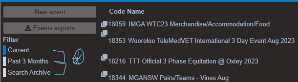 Select the event you are managing. If your event is in the past 3 months you will need to select the past filter. If it is more than 3 months in the past you will need to Search Archive. If your event does not appear then you may not be set up with admin access for this event or you have logged in with the wrong email address. Contact the Event Secretary Office.