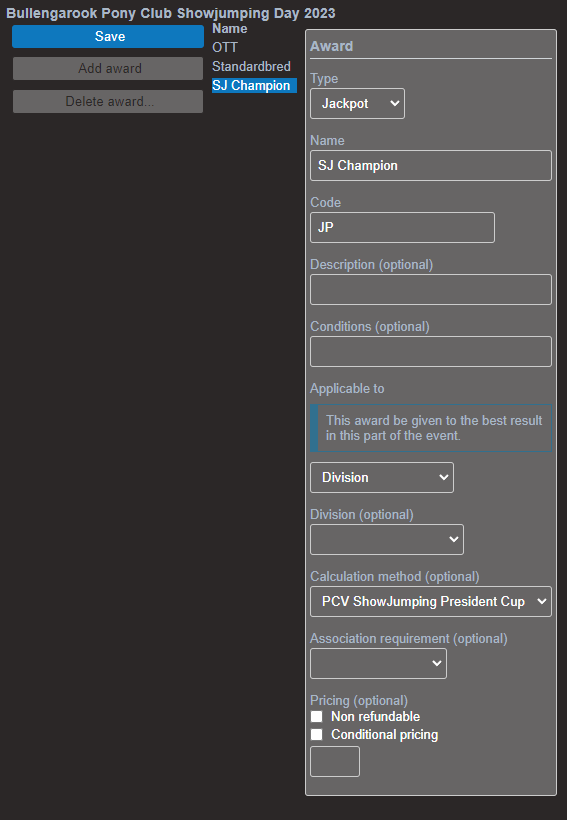 - Set the calculation method for Jackpot Awards if using a non default method. For example CZ uses President Cup scoring for Showjumping Events while SMZ uses World Cup Scoring.