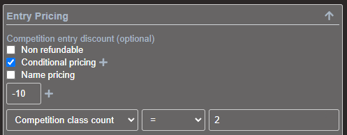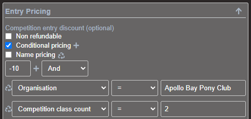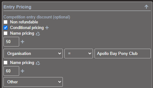 Conditional Pricing is where you want a cost to be conditional based whether a set of conditions are present or not. For example if a rider is a member of the host club they may receive a discount to their entry fee. Note: Conditional pricing is usually used to give discounts but it can also give surcharges. If providing a discount make sure to include a negative sign.