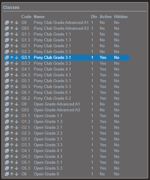- Class order can be rearranged by selecting the up/down arrows. This will impact countback scoring as well as number sequencing!