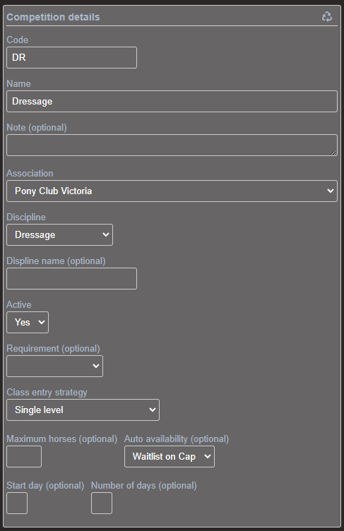 - Association - The association the Competition is running under. Pony Club, HRCAV, EA etc. Different competitions can be run under different associations for the one event.