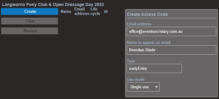 If a mistake has been made an access code can be revoked by selecting the code and then selecting Revoke.