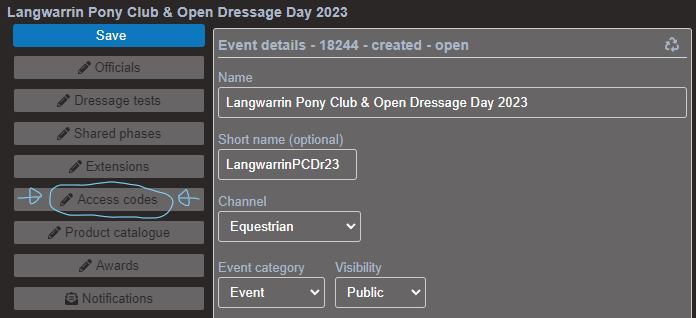 To send out Early Access Codes first go to Event Details and select Access codes.