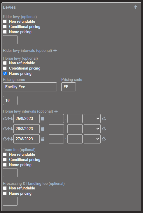 Levies can also have intervals for events held over multiple days. Unlike Yards or Camping levy intervals are set on specific dates rather than free form text. This is because the levy is charged based on the dates when the combination is competing. For example if the Horse Levy is $16 per day and a rider is competing in Dressage which is held on Monday and SJ which is held on Wednesday the system will automatically calculate the Facility Fee to be $32. Riders have the option to pay the Facility Fee for additional days if required. For example with the previous scenario the rider could add the facility fee for Tuesday if they were staying at the Venue between the two competitions. Note: Because the exact date is used this needs to be updated when the event is copied for a future year!