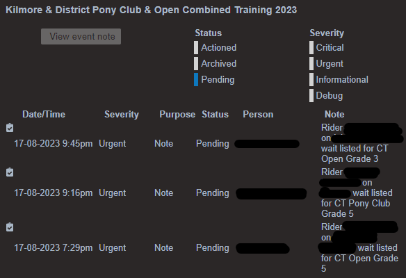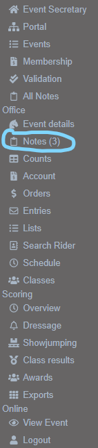 Notes are generated by the system to let you know of changes to entries after closing. For example a rider can return to their online entry after closing and request to change from Pony Club Grade 3 to Open Grade 3. This will then appear as a note. You can then decide whether to accept or reject the change.