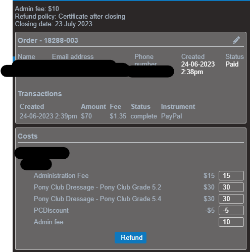 - Add in the amount you wish to refund for each payment category. This is usually the same amount as the amount paid as the admin fee is deducted separately.