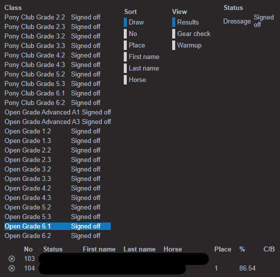 - You can select Gear Check and Warm Up to view which riders have been Gear Checked or Marshalled. You can also manually gear check and marshal riders here.