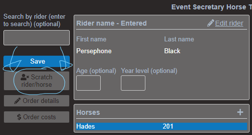 - Select Scratch rider/horse which is located under the save button. (Note:You don't need to select the horse or class that is being scratched yet)