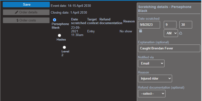 After a rider has been scratched you can then select Order details to scratch their horse facilities, ground facilities or products or you can select Order costs to process a refund for them.