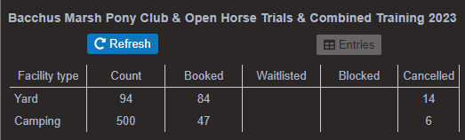 To view how many horse facilities have been booked go to Counts -> Facilities. Note: Booked is how many yards are currently booked and does not include waitlisted or cancelled yards.